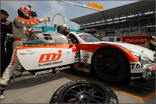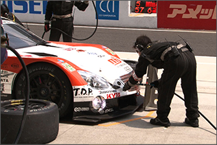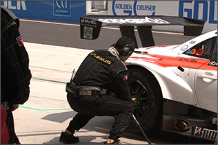 ・給油リアタイヤ交換終了と同時にプラグイン ・1秒当たり約3リッターの給油が行われる ・給油中はドライバー交代以外の作業禁止の為この間にタイヤ交換メカニックはリアからフロントへ移動