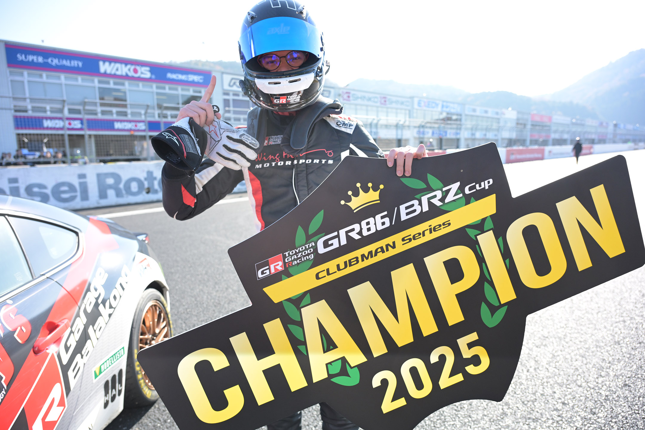 「2018年に86/BRZ Raceに参戦し始めて今年で8年目になりますが、ようやくチャンピオンを獲得することができ、いまは嬉しい気持ちよりもホッとしています。これまでシリーズ2位や3位を獲得したことは何度かありましたが、自分のミスでチャンスを逃してきたので、今年はレースの順位よりもチャンピオンを獲ることを最優先に考え、必ず獲るという強い思いで挑みました。今シーズンは予選タイム抹消が2回、マシントラブルによってスペアカーでの参戦が2回と、レースウィークに何事もなかったときの方が少なく、今回のレースウィークでも水曜日にレースカーが壊れてしまいました。『自分はこのシリーズでチャンピオンを獲得することができないのではないか』と思うこともありました。それでも、チームが木曜日にはスペアカーを用意してくれて、短時間でいつも通りのパフォーマンスを引き出せるマシンに仕上げてくれました。予選でブリヂストン勢トップの4番手になれたので、決勝レースは接触やトラブルがないように、冷静なレース運びを心がけました。ここまで時間はかかってしまいましたが、ようやくチャンピオンを獲得することができ、チーム代表やスポンサー、多くの関係者に恩返しできたかなと思います」