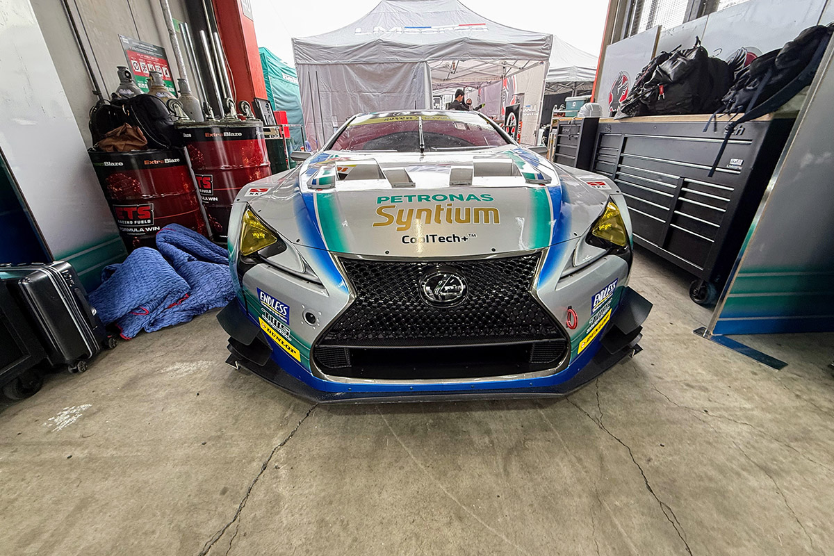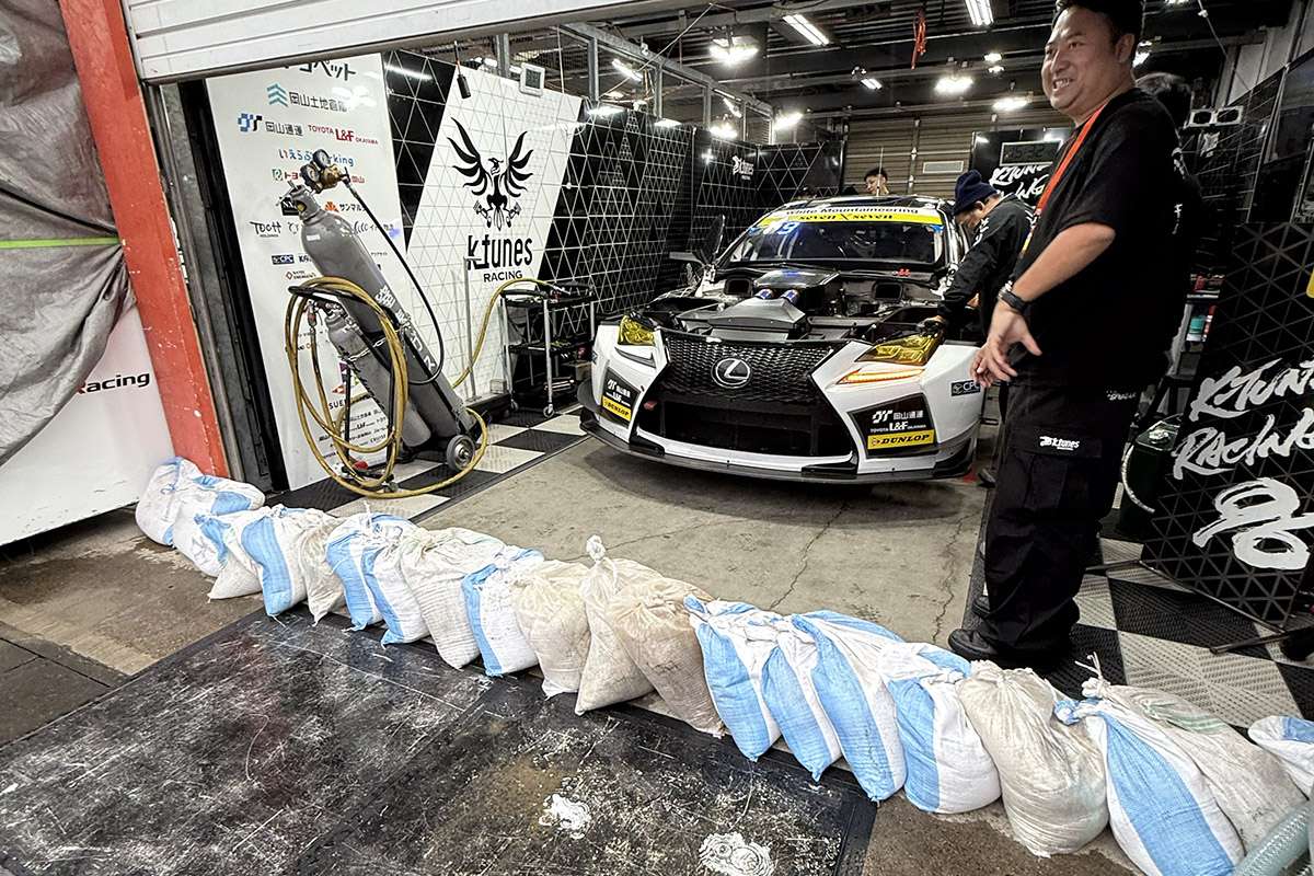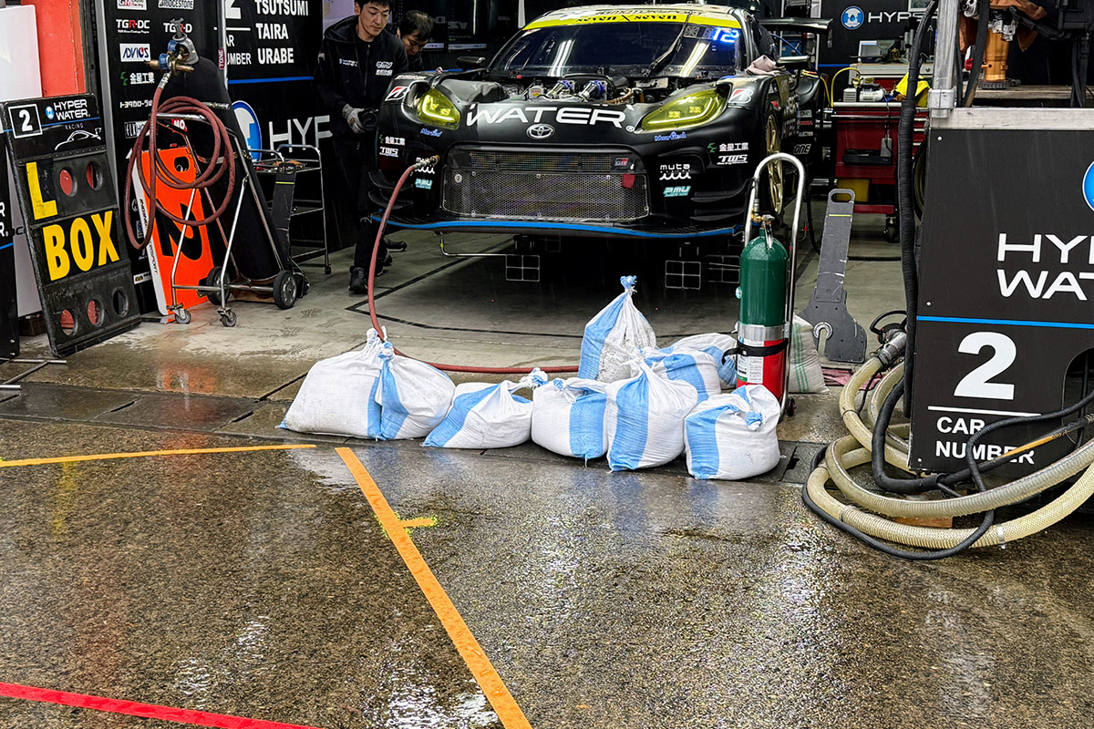 この日の午後は雨が降ってしまい、サーキットが用意してくれた土嚢をピットの前に積み上げる作業をチームのみなさんがしていました。メカさんたち、あれこれ大忙しです。そんな中、2号車HYPER WATER INGING GR86 GTは、きっと作業が終わってから並べるのかな? 96号車K-tunes RC F GT3は、早々に整然と。メカさんの性格なのかな。にしても、ピットに水が溜まるのは避けたいものです。