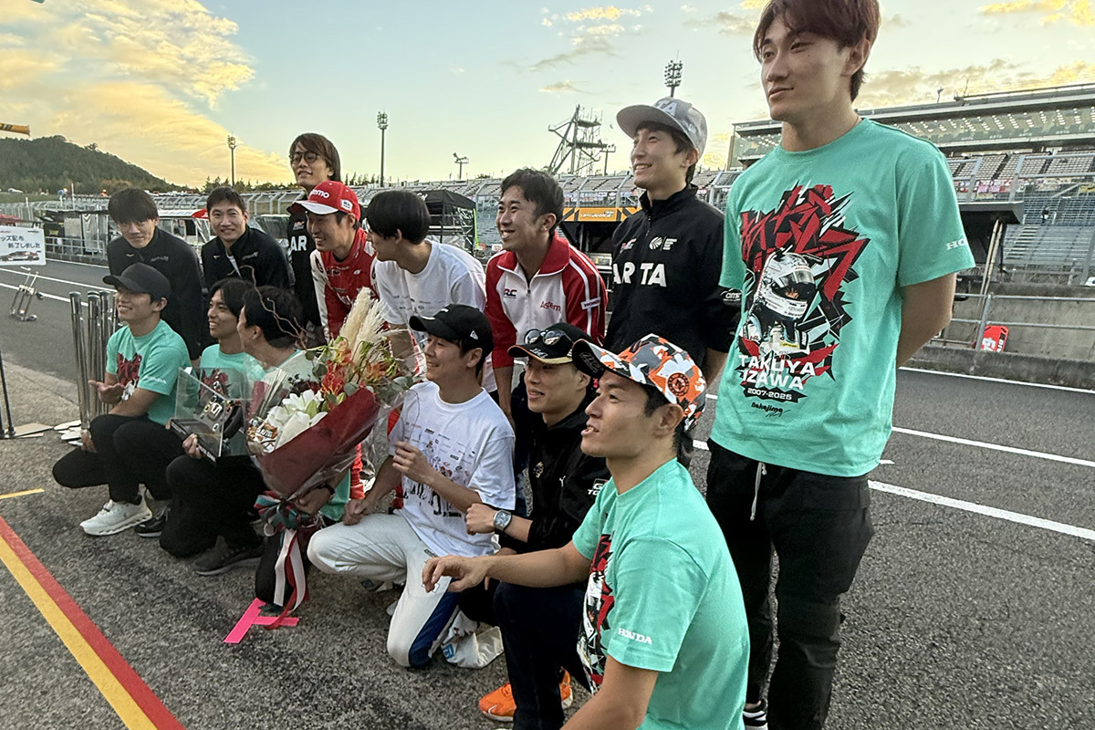 ピットウォークやドライバーアピアランス、トークショーに表彰式など追いきれないのが、最終戦。石浦くんのお別れのタオルを掲げるチームもありました。阪口晴南選手は、立川監督の時もそうでしたが、ヘルメットのカラーリングを石浦くんのヘルメットと同じリバリーにしてレースに挑みましたよ。先輩思いです。チームメイトの大湯都史樹選手は、花束を渡しました