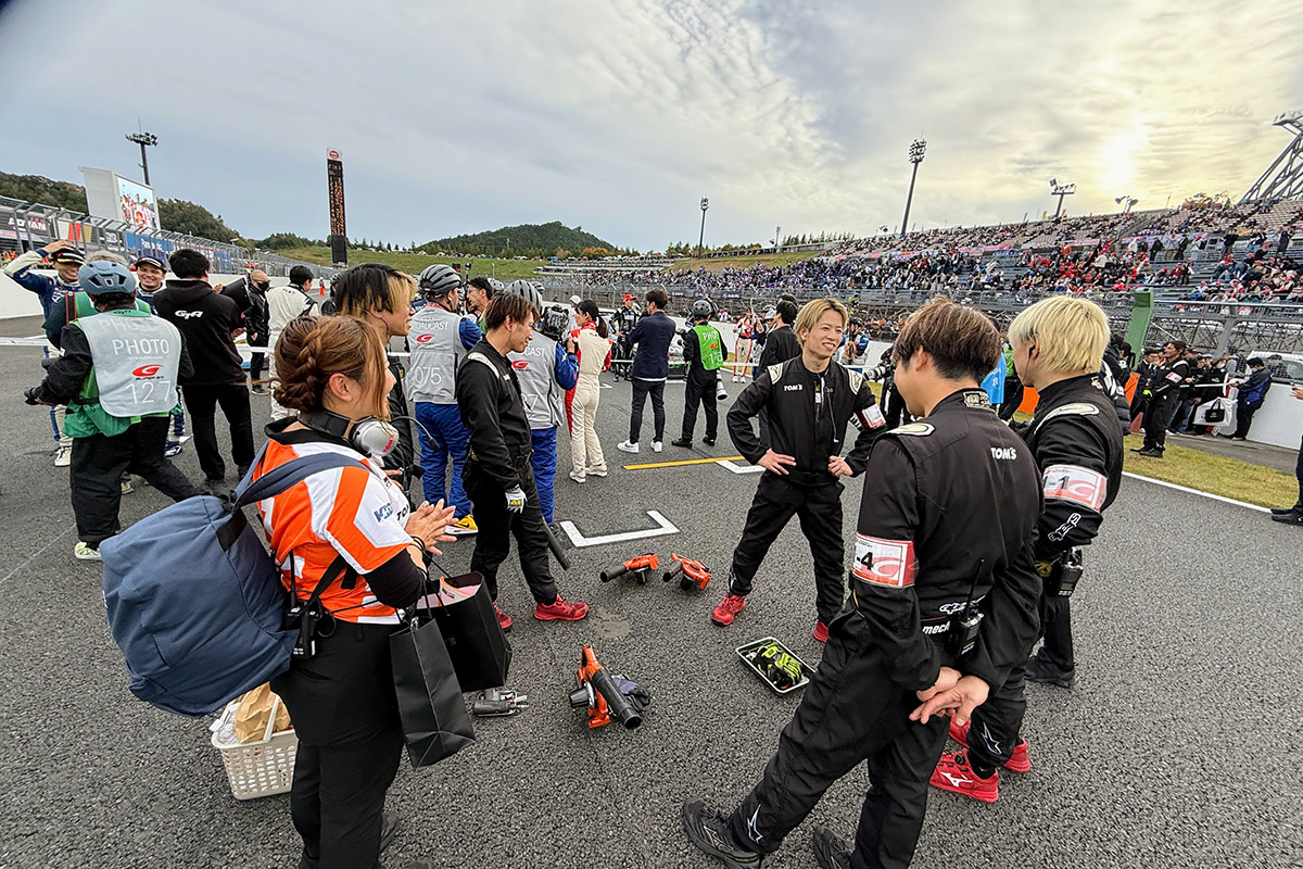 チェッカー直前、いつものピットに伺いました。片付けしてていつものチームで笑ったけどね。これが良い意味で勝ちに慣れたチームだと思います。そして、サミチーフメカはタイヤ交換ダサかったといい、一緒にタイヤ交換している岩森くんは、推し活(笑)。