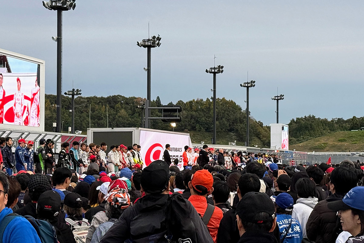 表彰式は、グランドフィナーレということで毎年ドライバー全員が登壇した中で行われます。プレゼントの投げ込みもね。ここで石浦くんの奥様とご長女ちゃんと久しぶりにお話しができました。赤ちゃんの時、ママが抱っこしている写真を撮ったはず富士でね。ママも変わらず元気そうで良かったです。三女ちゃんが、パパがGT500を下りると言ったら泣いたという話を石浦くんがしていましたが、そうだったようでね。私も驚きましたが、それでも石浦くんは走り続けるからまだまだ楽しみがいっぱいなはず。まずは節目に良かったです、会えて。