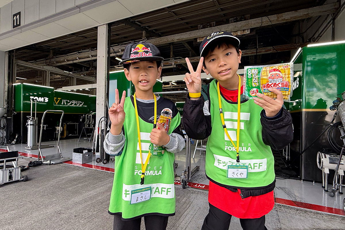 グランドスタンド側にも少し行き、ピットウォークも少し見て回りました。キッザニアの子どもたち、めちゃくちゃお手伝いをしていました。たくさん配ってくれてチームのお兄さんはホント助かっていましたよ!