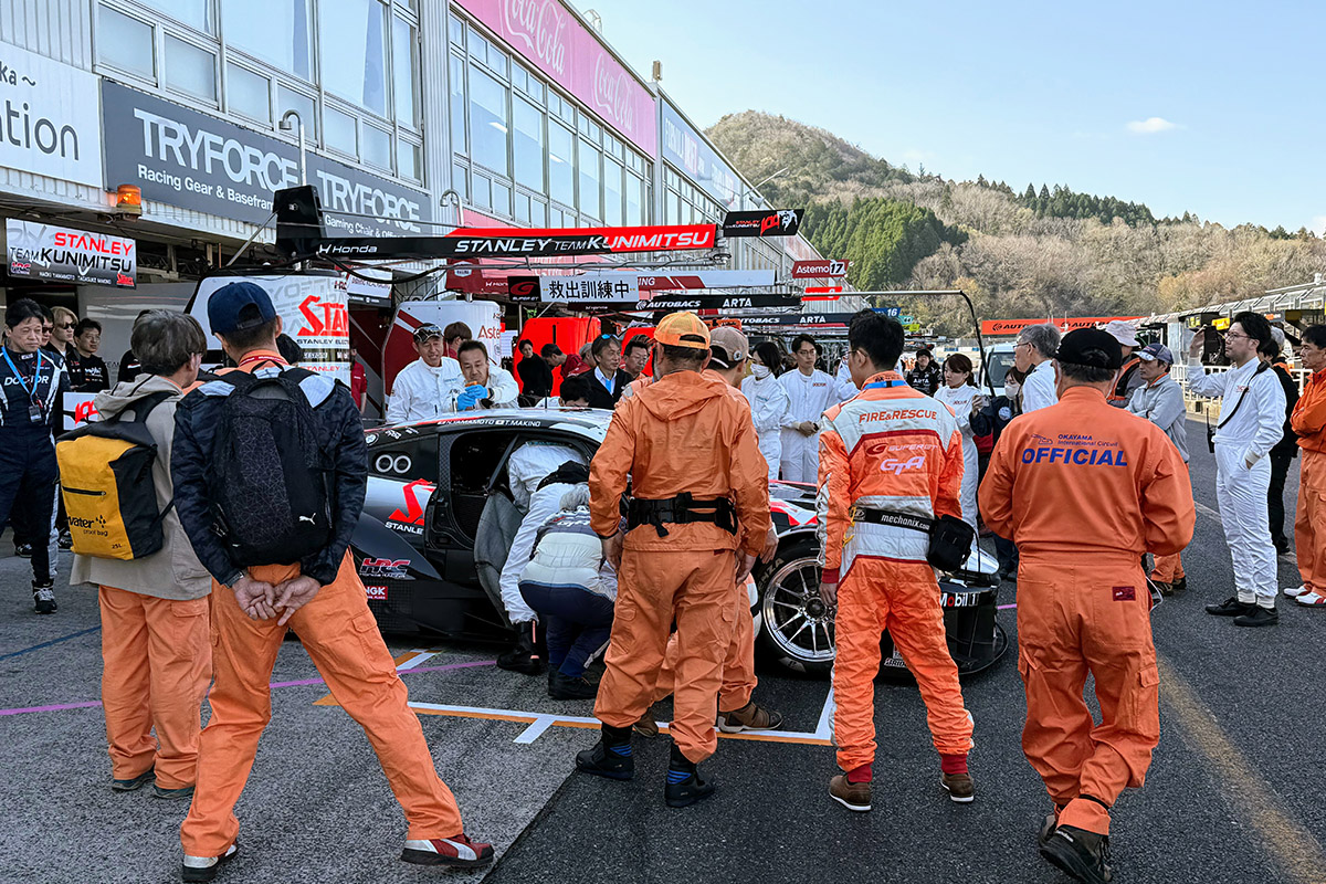 土曜日朝に行われる救出訓練は、100号車STANLEY HRC PRELUDE-GTを使用し朝から練習に励んでいました。いつもより、1時間くらい遅い午前8時から開始していましたのでドライバーたちの出勤時間とも重なり興味深く見学をしていました。この練習は本来ドライバーを救出するためのものですので、彼らが行うこともできます。やや早い時間帯に実施されて来た為か、もしくは負担軽減のためか、メカニックが代わりに参加していますね。終了後は、ドクターや練習に参加していたオフィシャルの方々から率直な意見を求められ、それに応じていました。ピットビューイングの際に、一般の方も見学できるのですが、今回はピットビューイングがありませんでした(理由は定かではありません)。