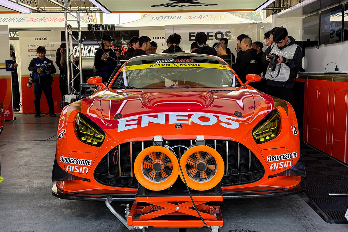走行の準備が始まっています。TEAM ENEOS ROOKIEがGT300クラスへ新規参戦し、32号車ENEOS X PRIME AMG GT3がついに初出陣を迎えました。フロントグリルの向かって左側に新たに色が施されました。GT300 クラス22号車アールキューズ AMG GT3が全く同じオレンジ色のため、正面から見ると区別がつかない様子。そこで色を入れたそうです。おしゃれにしたのかと思ったら、実用的な理由でした。