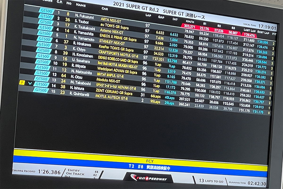 1つ目は、終盤の97/110周目、トップ走行中の8号車 ARTA NSX-GTに審議中の表示。まさかのイエローフラッグ中の追い越し違反。300クラスは500クラスが来たら避けるし、500クラスも前に出ちゃいます。しかし、残念ながらルールはルール。ドライブスルーペナルティで8号車は優勝争いから脱役しました。彼らも凹んでいる時間はなく、次もサクセスウェイトが比較的に軽いので優勝候補、勝ちに来ますね。