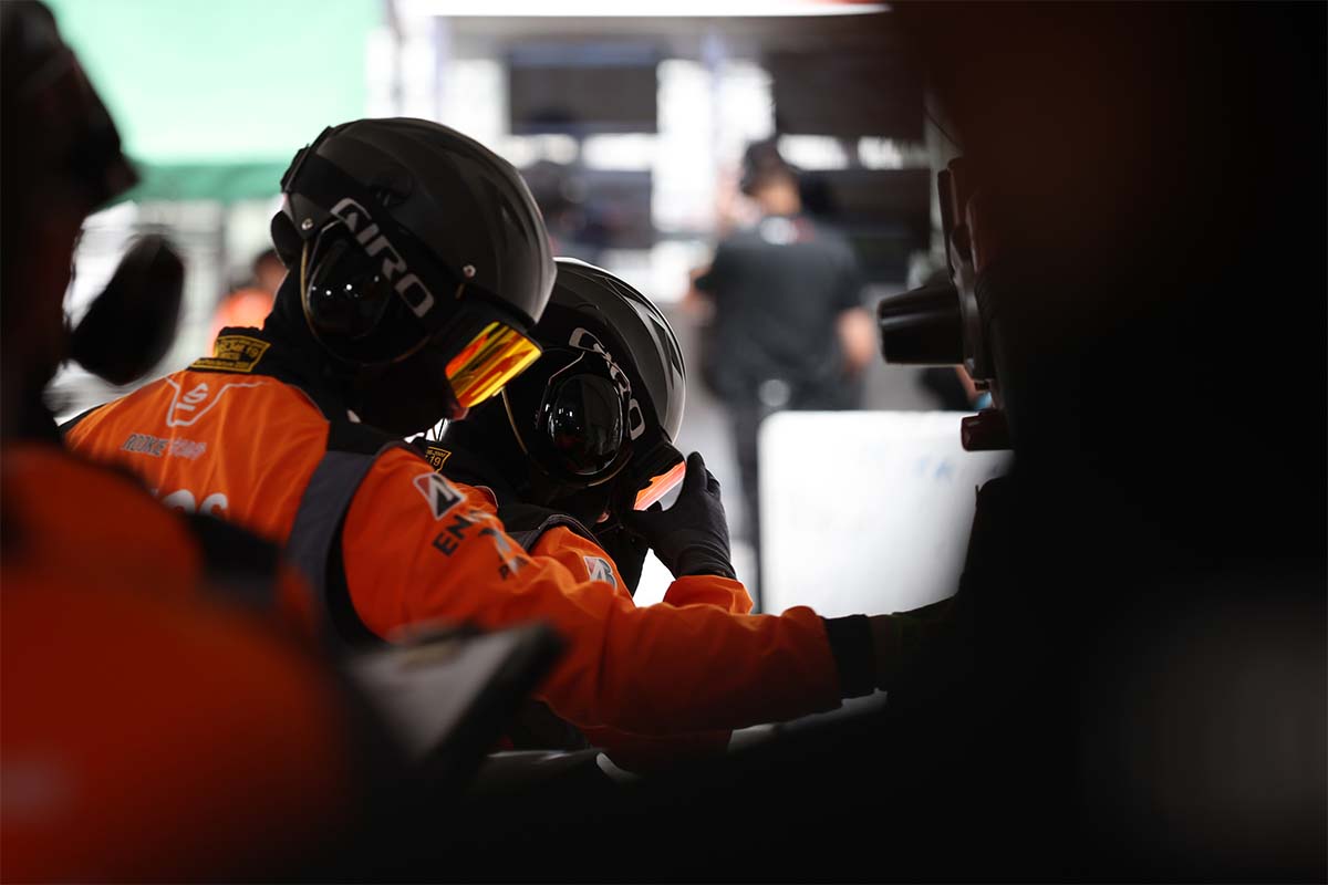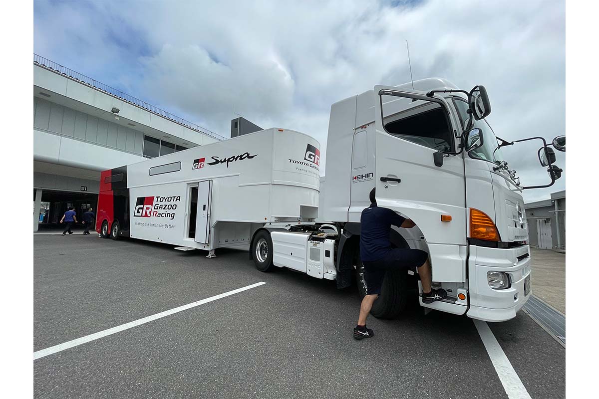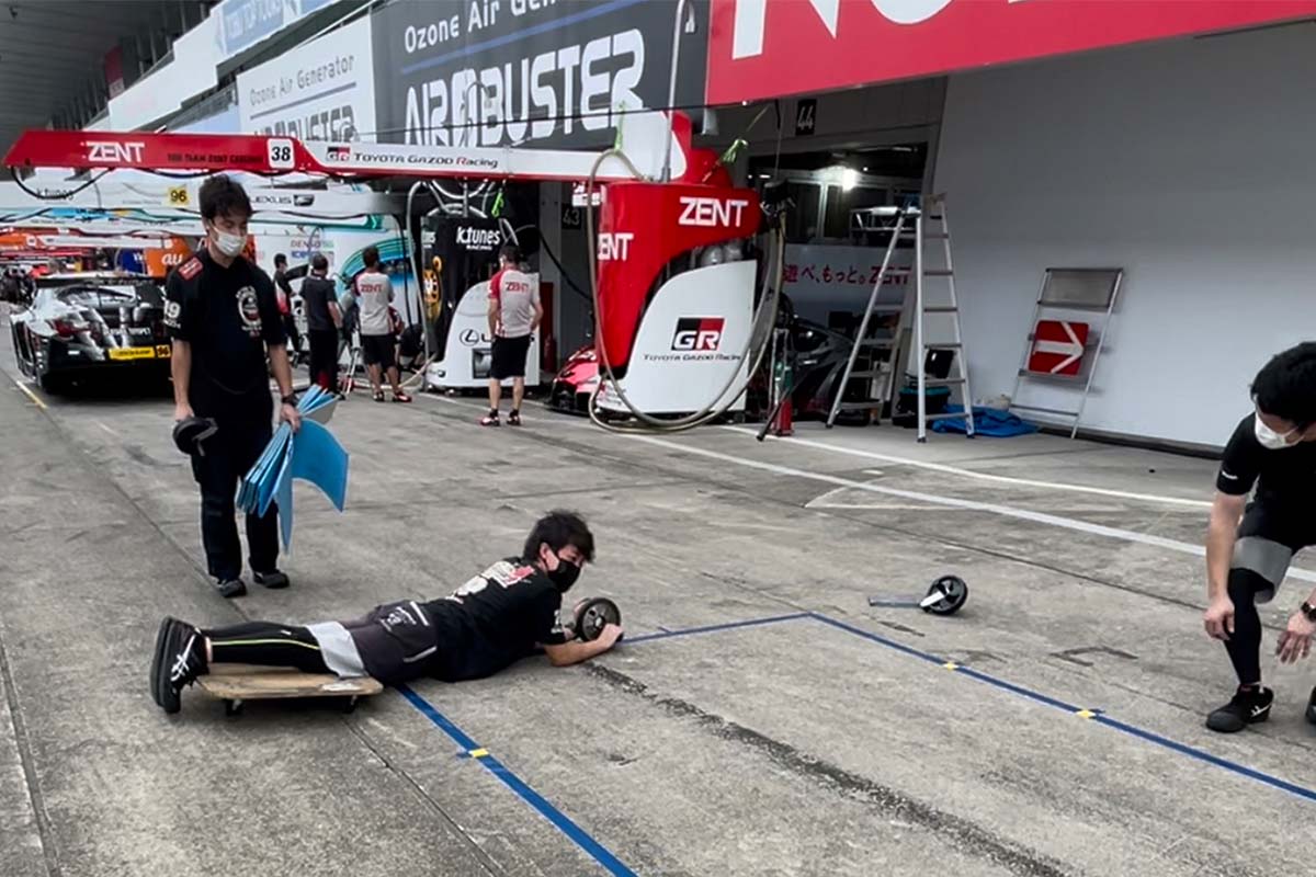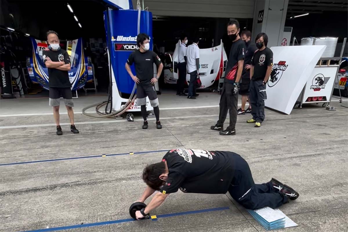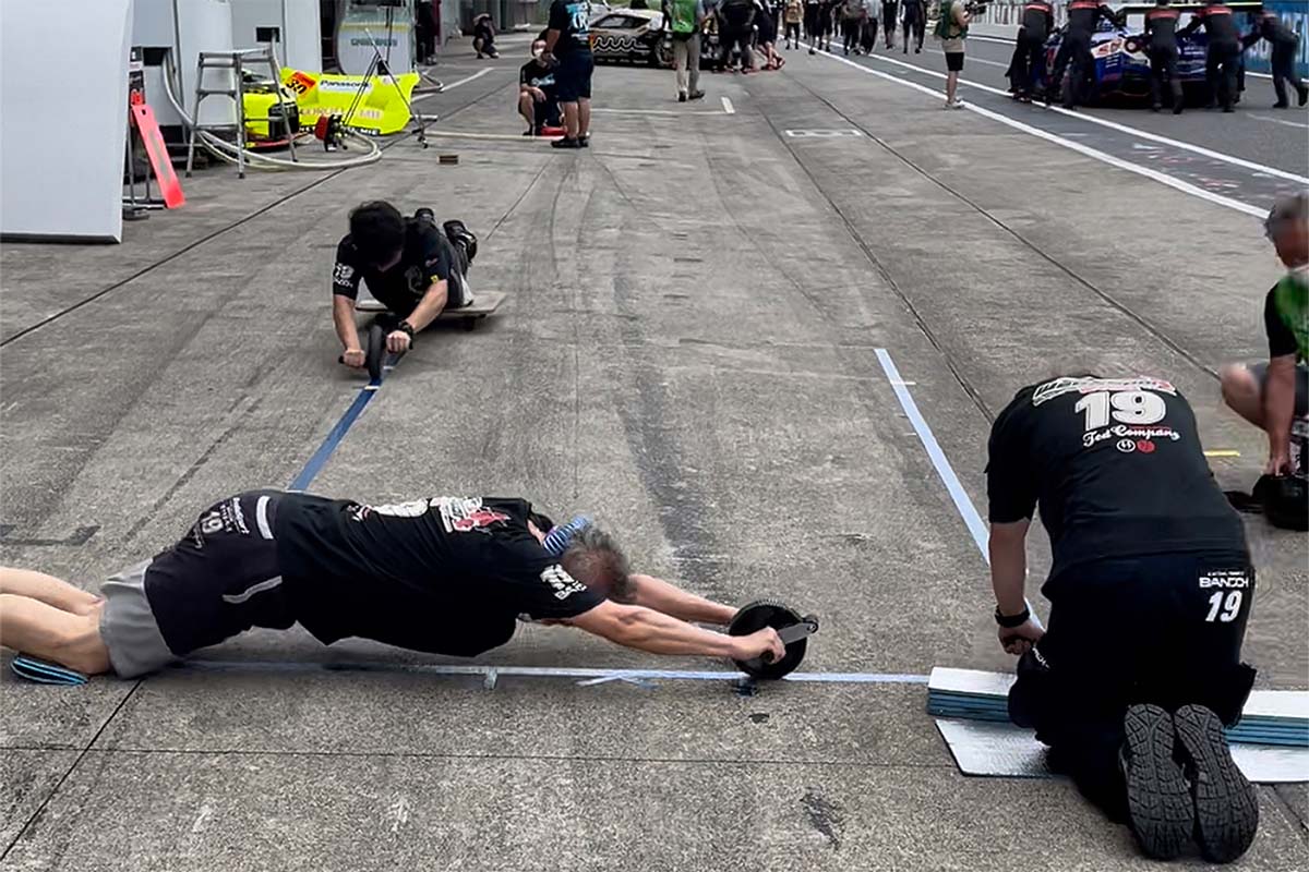 搬入日のトピックを。19号車WedsSport ADVAN GR Supraのピットクルー。これ遊んでいるのではないのです。ピットボックスの位置をガムテでバミっているのですが、剥がれないようにどのチームも金づちでトントン叩いたりして彼らは、鍛えつつ、補強するんです。人生の大先輩は体力ありますねえ。この業界、総じてベテランたちはスキルだけではなく、体力がめちゃくちゃあるんですよね~。ほんと感心します。そしてメカニックは、鍛えている方が多い!チームで体力作りがルーティンになっているところもあるんですよ。タイヤ交換の速さにも影響しますからね。地道な努力を重ねてレースに臨んでいます。