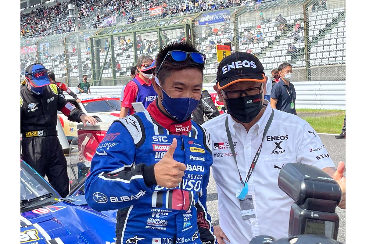 最大のハンデを背負う14号車は、とにかく辛いレースとなりました。もう少し我慢ですが、2戦ノーポイントで、ランキングトップをチャンピオン1号車STANLEY NSX-GTに明け渡してしまいました。燃料リストリクター2ランクは、かなり辛いですね…。周囲も重くなるのを待つしかないです。チームオーナーでもあるモリゾウさんが来られていて、レース後にSWおろせば大丈夫!とチカラ強く語ってくださいました。写真は、GT300クラスのポールポジションのSUBARUさんと近かった為、一緒に写真を撮られているときのもの。山下健太選手になぜかこの時以外遭遇しなかったレースウィークでした。