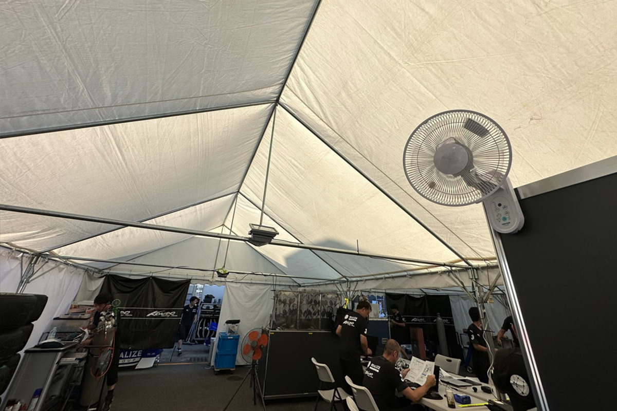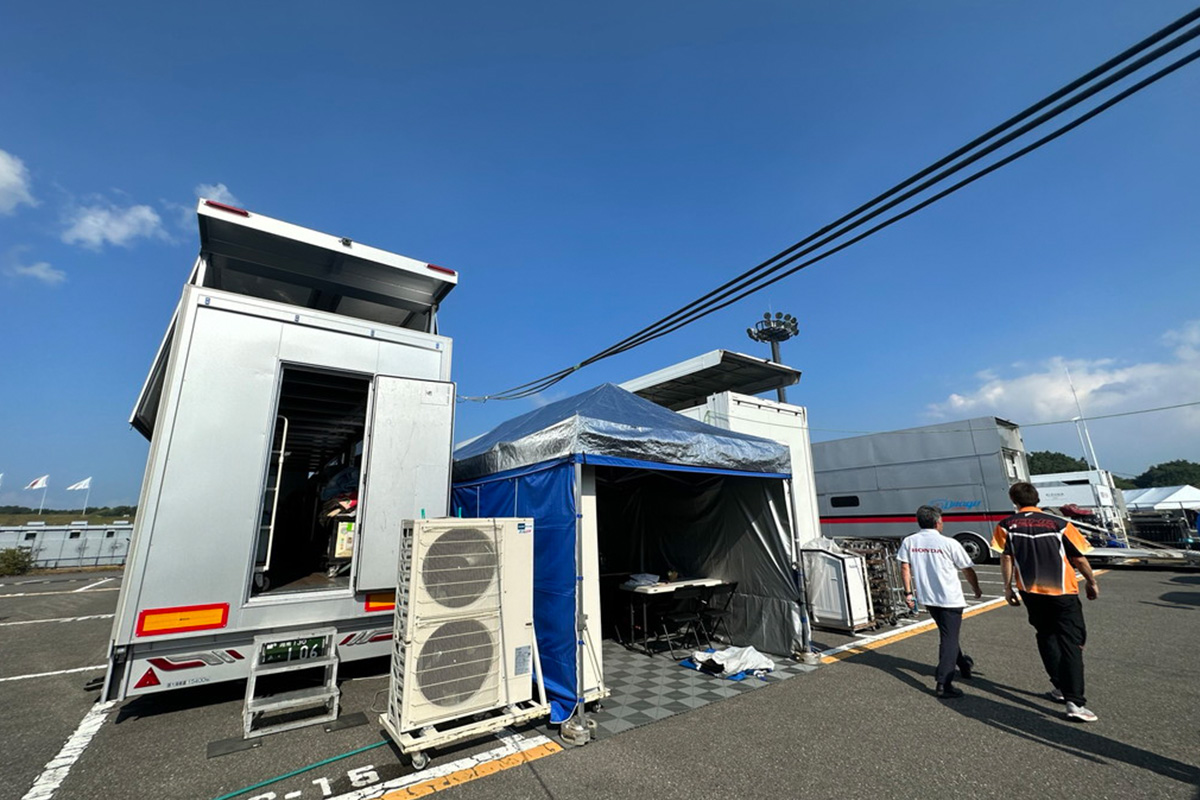 もてぎのパドックはコンパクトですし、コントロールタワーのみでピットの上に建物がないので、自分たちのエリアにホスピなどを作らないといけません。スタッフの場所も確保して大変です。ゲストさんも来られますが、テントだけだと良い感じに茹であがります、きっと。エアコンを運んできているチームも多く。自宅のエアコンは、エアコン業者がとりつけるものだと思っていた私は、レーシングチームってなんでもできるんだなと尊敬。以前、某関係者の自宅のウッドデッキを手作りした際に、隣のお家の建築業者さんが作ったものよりもメカニックたちが作ったものの方が出来上がりが良かったという笑い話がありましたね。ほんとメカさんは器用で驚きます。