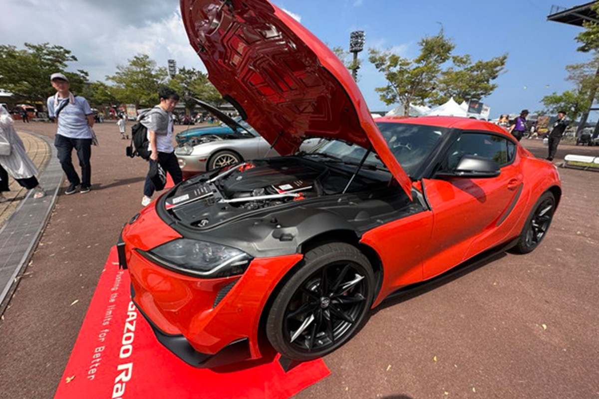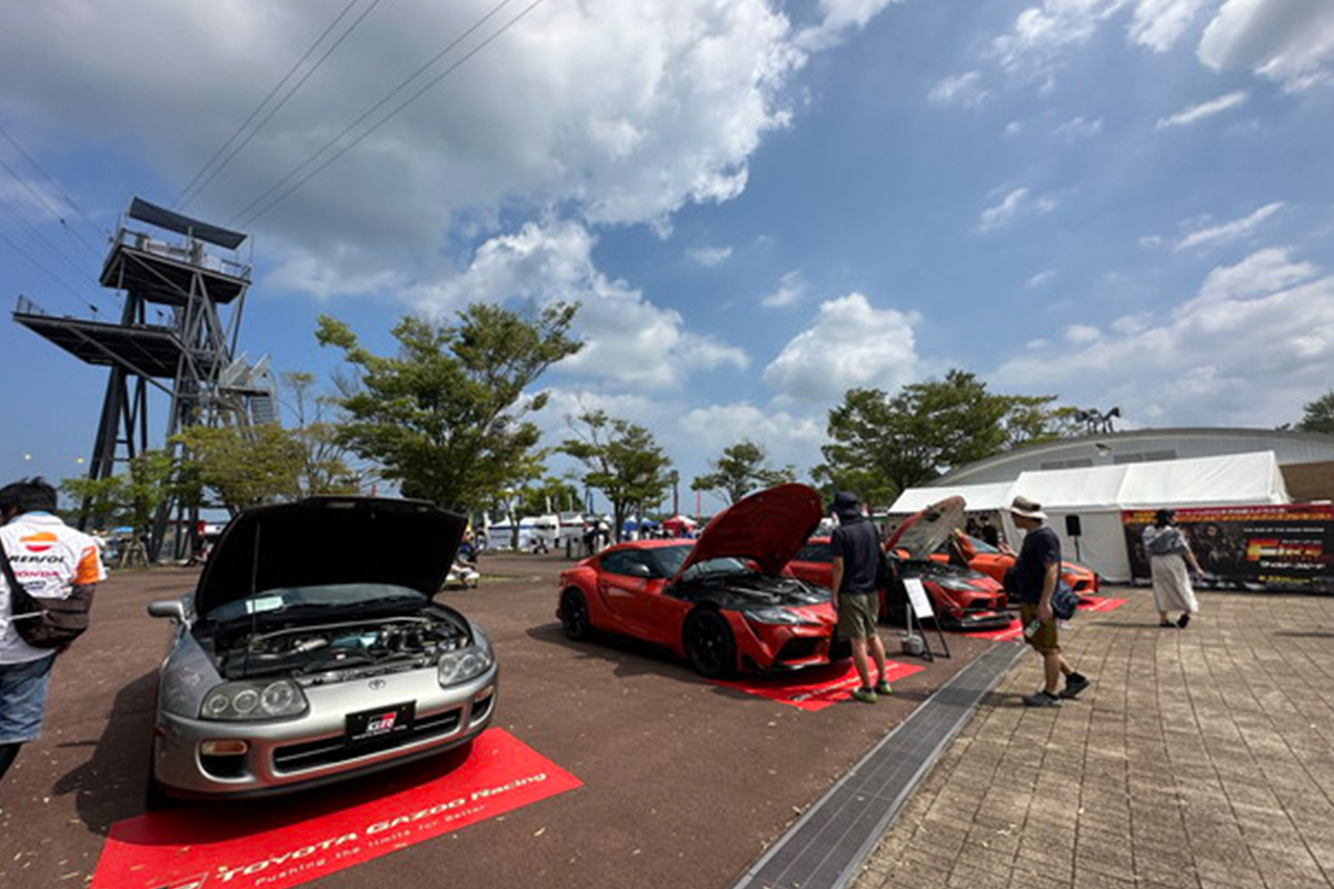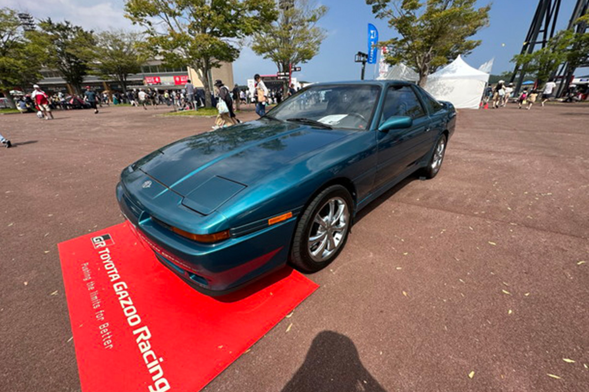 お!70スープラ!歴代のスープラの展示がありました。キレイすぎる復刻モデル。左ハンドルの70スープラですね。これミラーを折りたたむ機能がないそうで(愚息に聞いた…)。車両開発をされている方々が手掛けたそうですが、さすがメーカーですね、新車レベルでピカピカでした。“ガワ”をこんなに綺麗に復刻できるなんてね、素晴らしい。