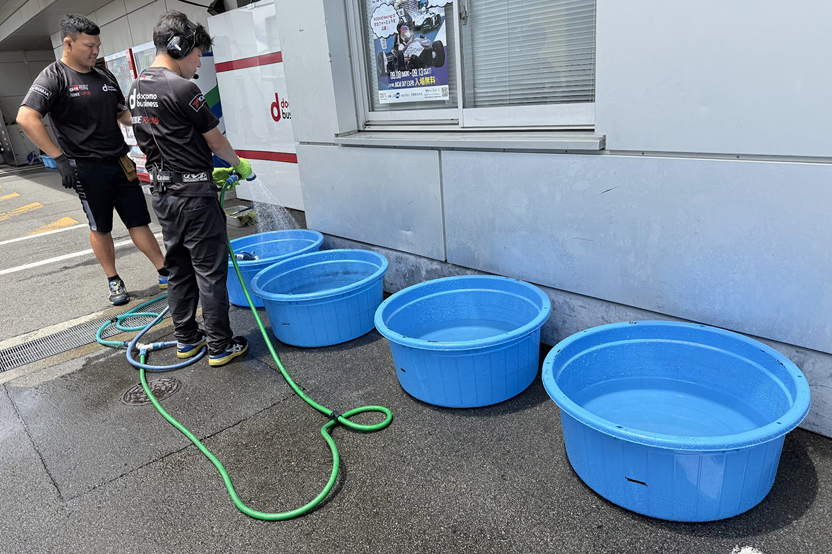 いつものタイヤを冷やす準備も各チームで用意されていました。走ってぐにゃぐにゃになったゴムを冷やして、コンパウンドを戻すためですね。でも今書きながら思ったのですが、やっていないチームもあるんですよね。この違いはチームの方針の違いですけどね。今頃気づきました。戦績にも差があるのか?自分の中で分析中。