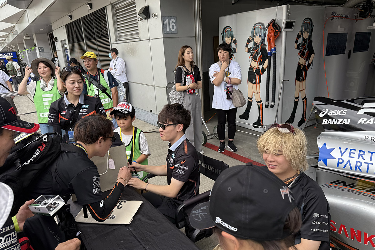 ピットウォークも大盛況!あとは、決勝を待つのみ。こちらのピットに伺ったらドライバーの後ろに、見たことのあるセルモの社員さん。ファクトリーが近いので、普段現場には来ないスタッフさんたちも応援に来たりするのが富士ならでは。久しぶりに会えてうれしかったです。セルモ長田さん、元気そうで何よりでした。