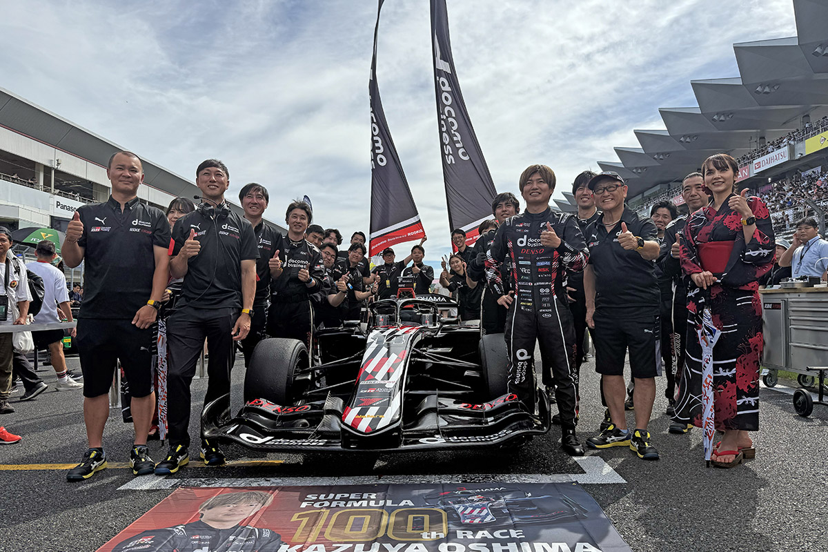 午後の決勝では、100戦目を迎えた大嶋和也選手(docomo business ROOKIE)のグリッドで、記念撮影が行われていました。記念のフラッグと共に撮影しますとお知らせいただき感謝です。