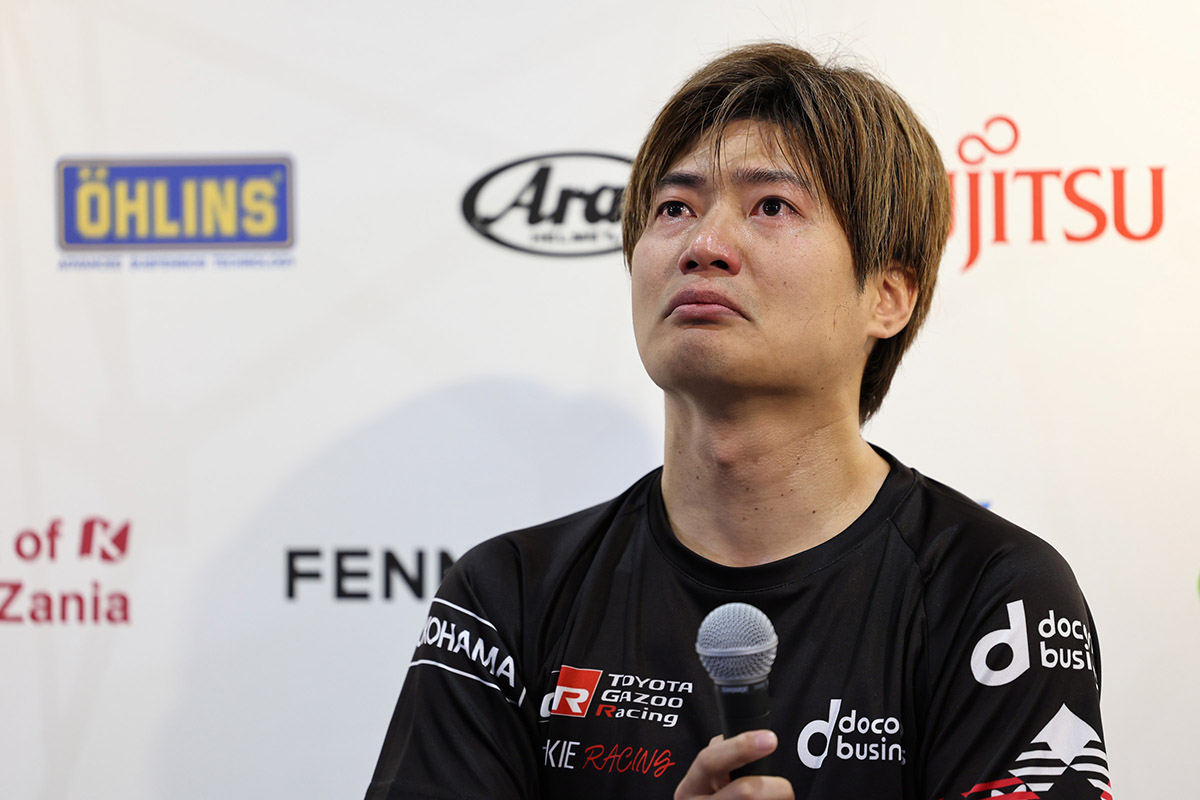 会見の中で、昨年辞めるはずだったけれども、チームオーナーにお願いして1年延長をしたとのことでした…。このシーンから大嶋くん、言葉に詰まり始めました。トムスでのデビューから始まり、チームルマン、そして新規チームのルーキーレーシングの立ち上げ、重責から解き放たれたのか(まだシーズンは終わってないけどね)、堪えきれないほどの大粒の涙を流しました。声をあげて泣いてもおかしくないくらいでしたね。