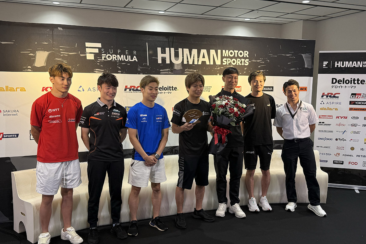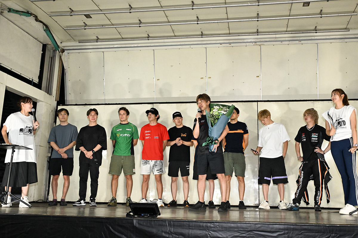 ステージには、全員が集合しました。大嶋くんより一年早くこのカテゴリーを退いた山本尚貴アスリート委員会委員長と今般引退を発表した大嶋くんが歩く姿は、ジーンと来るものがありますね。