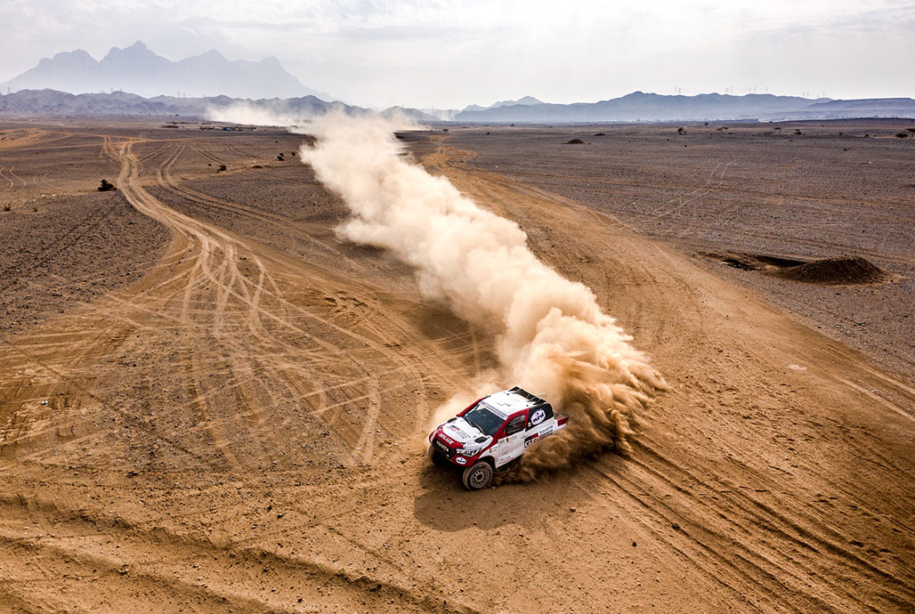 前走車の巻き上げる土埃をものともせず、アロンソとコマのスペイン人コンビは今回新しく組み上げたトヨタ・ハイラックスを駆り、首位と7分24秒差の4位で最初のステージを終えました。このトヨタ・ハイラックスは、サウジアラビアに持ち込まれた時点で僅か20kmしか走行していない車両であったため、アロンソとコマは、最初のステージではリスクを負わない走りに徹しました。