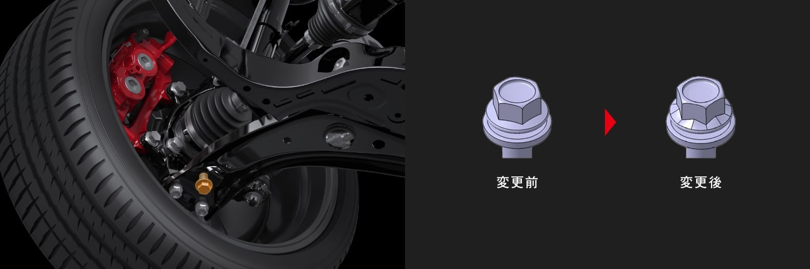 シャシー部品の締結ボルトの一部に締結剛性の高い特別なボルトを採用。ステアリング操作に対する応答性と直進安定性を向上し、クルマとの一体感を進化させた。