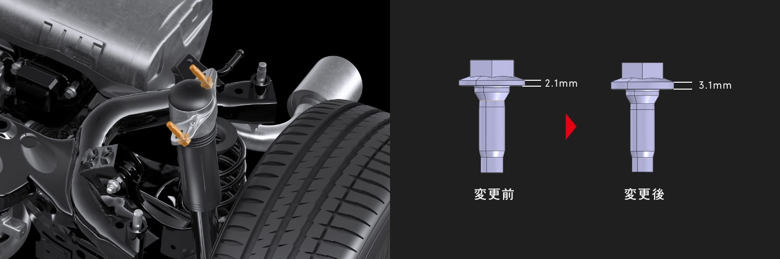 「クルマとの一体感の進化」におけるボルトの変更や、その他一部のボルト類の締結トルクアップに合わせて、サスペンションセッティングを再適合。ショックアブソーバーの減衰力を調整することで、コントロールと乗り心地の両立を図った。