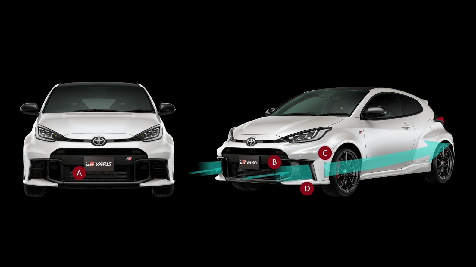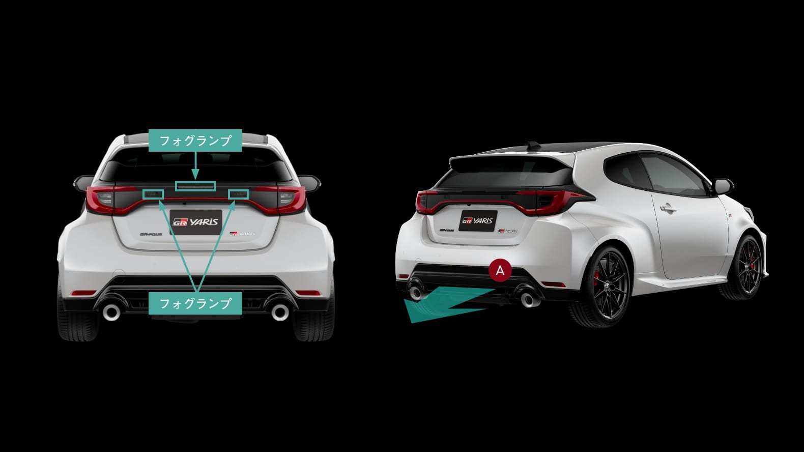 モータースポーツ参戦中の損傷回避と視認性を考慮し、リヤランプ類を中央へ集約。一文字に繋がる一体感のあるテールランプとすることで、GRヤリスらしい性能由来のデザインとしたほか、ハイマウントストップランプがリヤスポイラーと別体になったことで、リヤスポイラーのカスタマイズ性を拡張。さらに、リヤロアガーニッシュ下端( A )に開口部を設け、床下からの空気を抜くことで、空気抵抗を下げ操縦安定性を向上させるとともに、マフラーの熱を排出している。