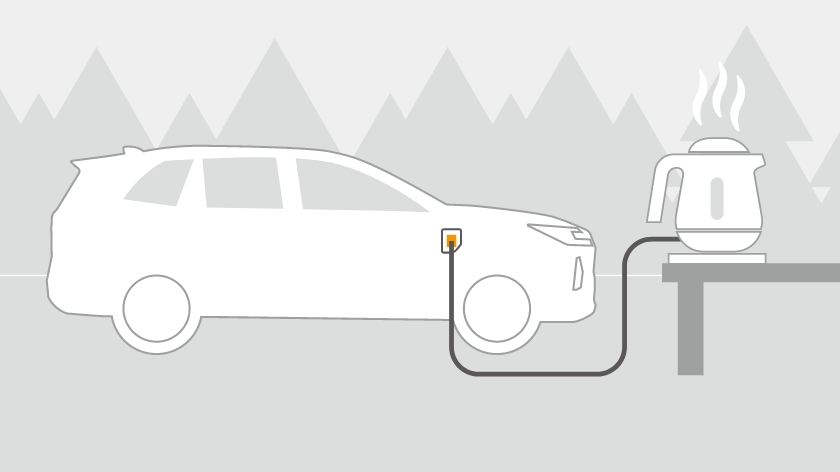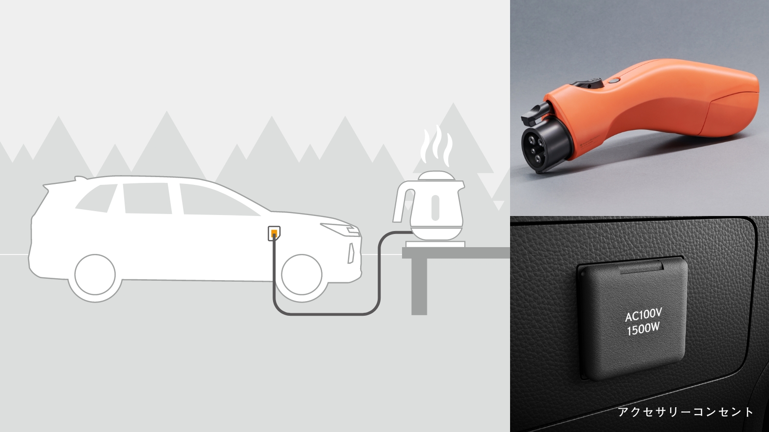 大容量のバッテリーに蓄えた電力を「走る」以外にも使えるPHEV。ラゲージに設置されたコンセントによる車内での使用に加え、付属のヴィークルパワーコネクターを普通充電インレットに挿し込めば、100Vの外部給電用コンセントに早変わり。合計1500Wまで対応するので、消費電力の大きな電気製品も安心です。