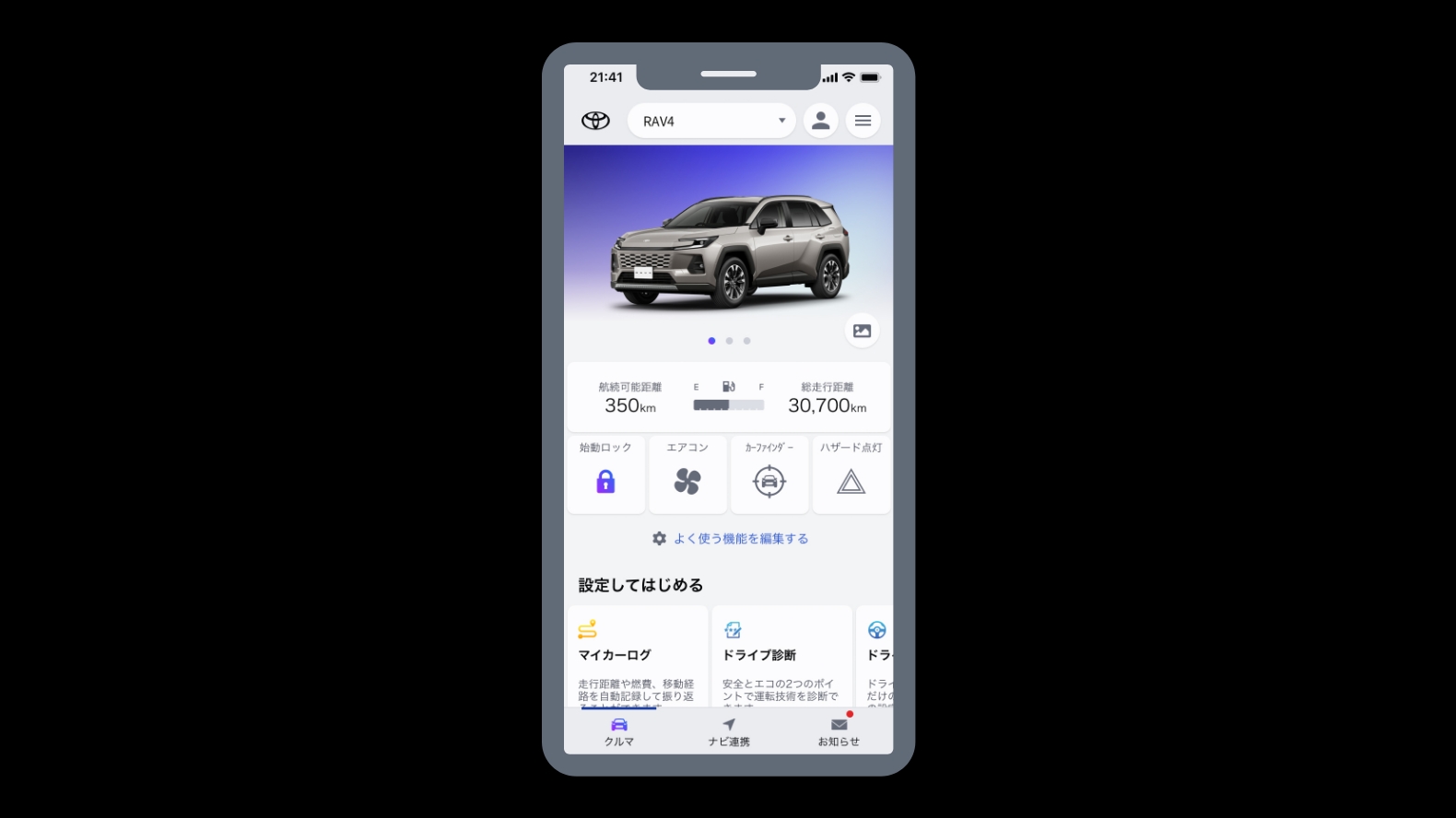 24時間365日、クルマが通信でスマートフォンやトヨタとつながることで、もっと安心にお乗りいただけるサービスです。