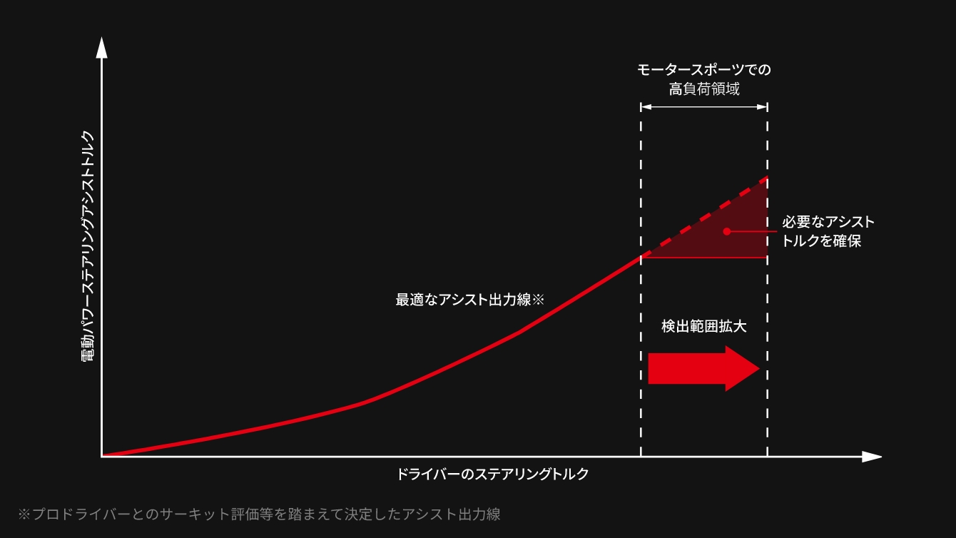 高負荷時もスムーズな旋回操作を可能に。電動パワーステアリングスーパー耐久シリーズや全日本ラリー選手権などで、ハイグリップタイヤに履き替えたことで、高負荷での旋回時に一瞬ステアリング操作が引っかかるという現象が発生していました。その改善のために、トルクセンサー内のトーションバー剛性を最適化し、ECU(電子制御ユニット)のプログラムもセットで変更することによって、ステアリングトルクの検出範囲を拡大。極めて高負荷での旋回時にも、最適なアシストを行い、スムーズなステアリング操作を実現しました。 -