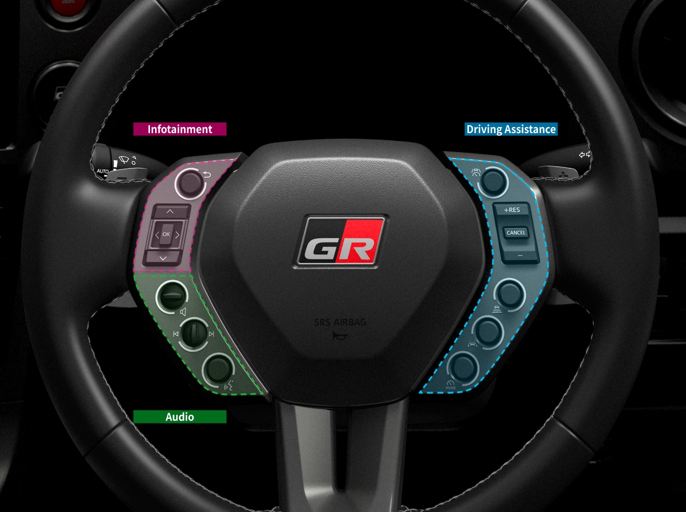 視線を逸らさず、運転に集中しながら各種操作が可能。ステアリングスイッチ(マルチインフォメーションディスプレイ・レーダークルーズコントロール・レーントレーシングアシスト・オーディオ・音声認識)マルチインフォメーションディスプレイの表示切替やオーディオ操作を行うスイッチの配置を、一から見直しました。モータースポーツで得た知見を活かし、各スイッチを独立配置とすることで操作性をさらに向上。また、スイッチ外周にはリング状のイルミネーションを採用し、夜間でも視認しやすいデザインとしました。より運転に集中しながら、スポーツ走行を安心して楽しむことができます。- Infotainment