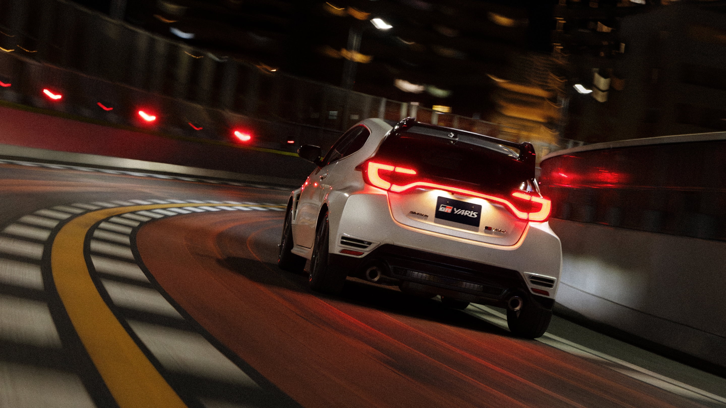 車両の運動性能を飛躍的に向上。エアロダイナミクスラリーシーンでのダウンフォースの獲得を狙い、リヤスポイラーへと効果的に風が当たるよう、ルーフ後端を下げたアッパーボディを専用開発。さらに、フロントのロアスポイラーやカナード機能を持つコーナー部、ルーフとクォーターピラーまわりを絞り込んだリヤの造形により、ダウンフォースを増大。車速を増すほどにボディが路面に押し付けられ、コーナリングスピードが高められる特性を実現しています。また、WRCマシンと同様の手法でホイールハウスからボディに沿って空気を抜くことで、空力性能を向上。さらに、ボディ下面の広範囲をアンダーカバーで覆うことにより、空気抵抗をいっそう低減しています。こうしたエアロダイナミクスの開発は、TOYOTA GAZOO RacingのWRCチームの施設で繰り返し行われた風洞実験の結果と、彼らとの妥協のないコミュニケーションの積み重ねにより造り上げられています。