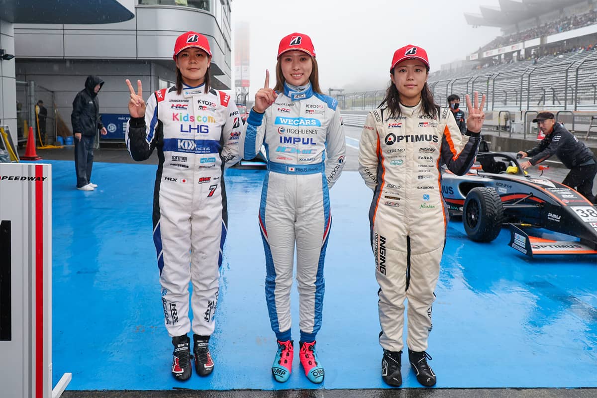 8時30分からの公式予選は、早朝から降り続く雨によってウェットコンディションで行われた。各車タイム計測を開始すると#7 翁長実希(Kids com KDDP KC-MG01)、#38 佐藤こころ(OPTIMUS CERUMO・INGING)の順でトップタイムを記録するが、コース入りを遅らせた下野がクリーンエアで1分56秒458を記録。佐藤のタイムを塗り替えて首位に浮上した。そんななか、翌周のセクター1で好タイムを記録した佐藤が100Rでスピンを喫し、コースサイドのバリアに接触。これによって赤旗が提示され、残り時間が3分を切ったところでセッションは再開を迎えた。しかし、マシントラブルに見舞われた#37 バートンハナ(BigBoss W TOM'S KYOJO KC-MG01)が100Rで停止。この間に翁長がトップタイムを記録するも、黄旗提示区間を走行して計測された翁長のタイムは採択されず、下野が今季2度目のポールポジションを獲得した。
