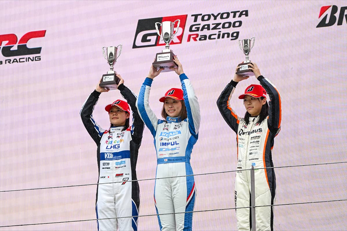 ポールシッターの下野はスタート手前の13コーナーから加速を始め、コントロールラインを通過した時点で2番手とのギャップを1.3秒まで築く。その後方では、4番手の佐藤がTGRコーナーで翁長にバトルを仕掛けるが、翁長も譲らず。逆にペースを上げて佐藤を引き離した翁長は前を行く佐々木に狙いを定めると、5周目にはKCMGの2台による2番手争いが勃発。佐々木がダンロップコーナーでミスを喫したことで翁長が一気に間合いを縮め、GR GTコーナーで2番手に浮上した。レースは折り返しを迎え、コース上ではスピンやオーバーランを喫するマシンが出てくるなか、ラップリーダーの下野は後続に対するタイム差を7秒以上に広げてレースをリードする。ファイナルラップを迎えた時点でのトップ3オーダーは下野、翁長、佐々木となり、KYOJO Sprintはこのままチェッカーフラッグを迎えるかと思われた。しかし、快走する下野が先頭でゴールして今季5勝目を飾り、翁長が2位でレースを終える後方では、佐々木が突如としてシフトトラブルに見舞われ、パナソニック オートモーティブコーナーでマシンを停めてしまう。佐々木は2度目の表彰台獲得を目前に11番手まで後退し、代わって佐藤が3位表彰台を獲得した。