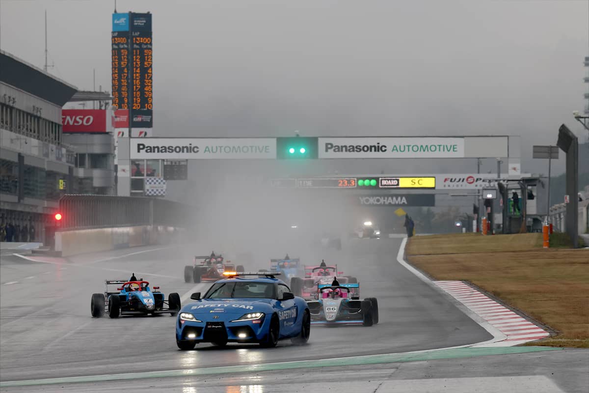 最終日の富士スピードウェイは早朝から濃い霧に包まれていたが、時間の経過とともに視界が回復。やがて霧が晴れると雨が降り始め、今季最後の一戦はウェットコンディションでの幕開けとなった。