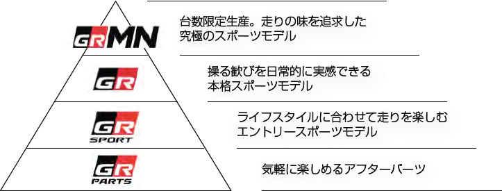 スポーツカーシリーズ「GR」は、エンジン内部にもチューニングを施した数量限定販売の「GRMN」を頂点に、GRMNのエッセンスを注ぎ込んだ量販スポーツモデルの「GR」、気軽にスポーツドライブを楽しめる「GR SPORT」、カスタマイズを楽しめるアフターパーツ「GR PARTS」で構成されています。