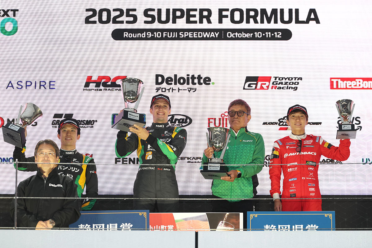 スーパーフォーミュラの第9戦、第10戦が富士スピードウェイで行われ、雨天で途中終了となった第9戦はサッシャ・フェネストラズ(VANTELIN TEAM TOM’S)が勝利を挙げ、坪井翔(VANTELIN TEAM TOM’S)が2位。第10戦は濃霧のため決勝はキャンセルとなりました。