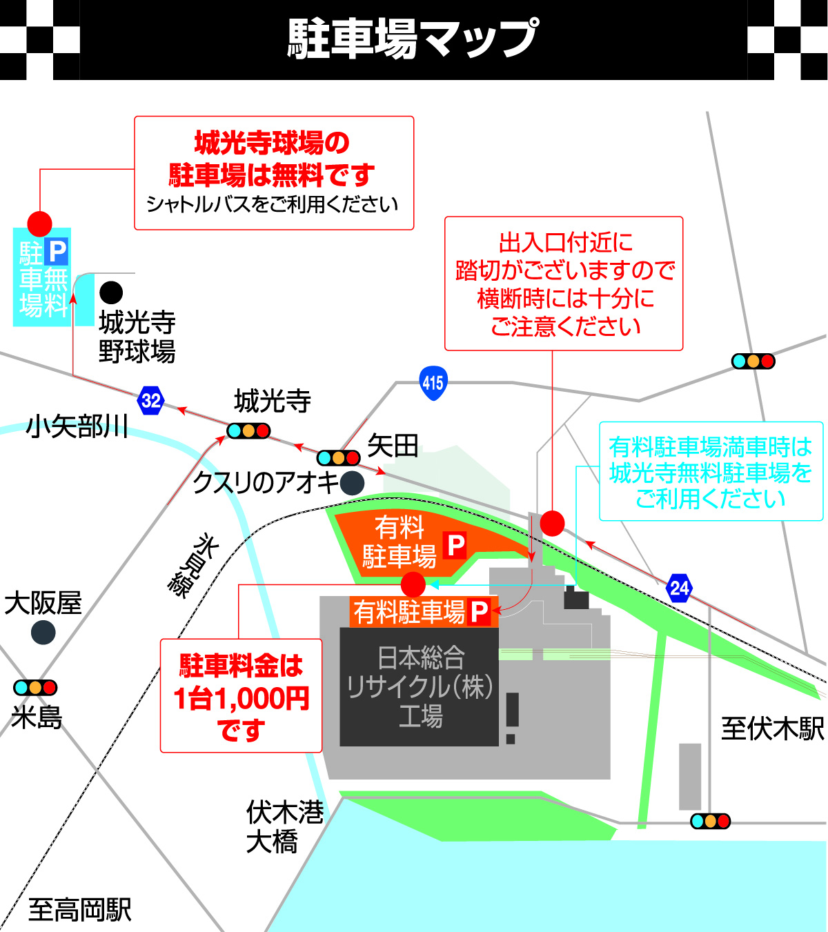 城光寺野球場に無料臨時駐車場をご用意しております。シャトルバスを随時運行しております。