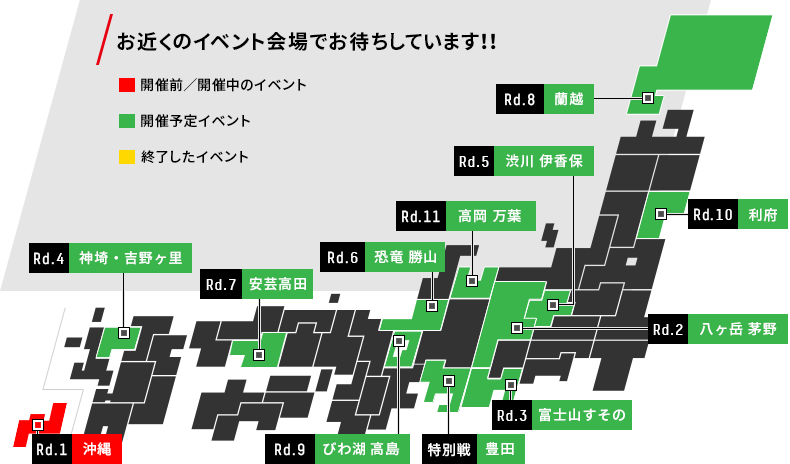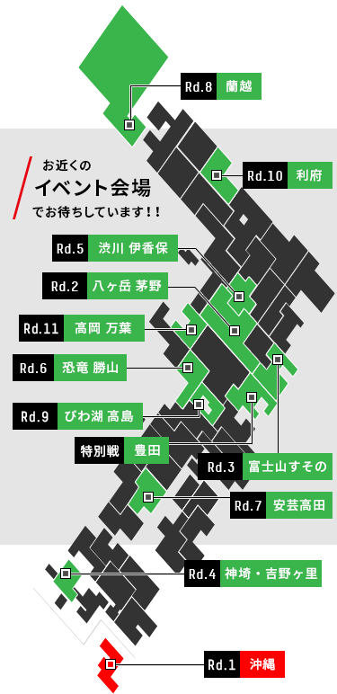全国のラリーチャレンジ会場や、サーキット、その他モータースポーツ会場、商業施設等で開催されています。